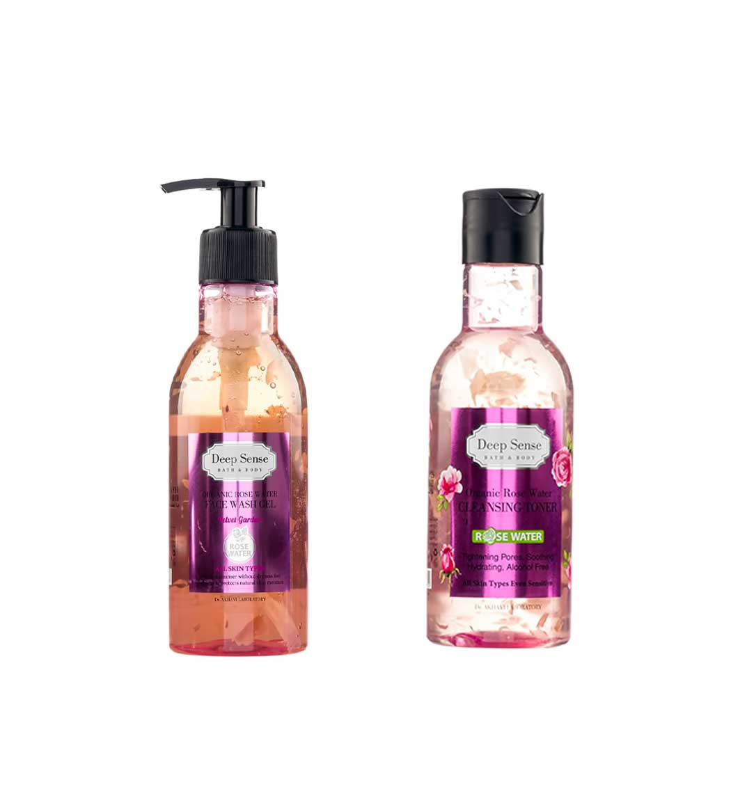 پک ژل شستشو صورت مناسب پوست حساس حاوی روغن آملا با رایحه گلاب 250 میل و تونر پاک کننده و مرطوب کننده مناسب پوست حساس با رایحه گلاب