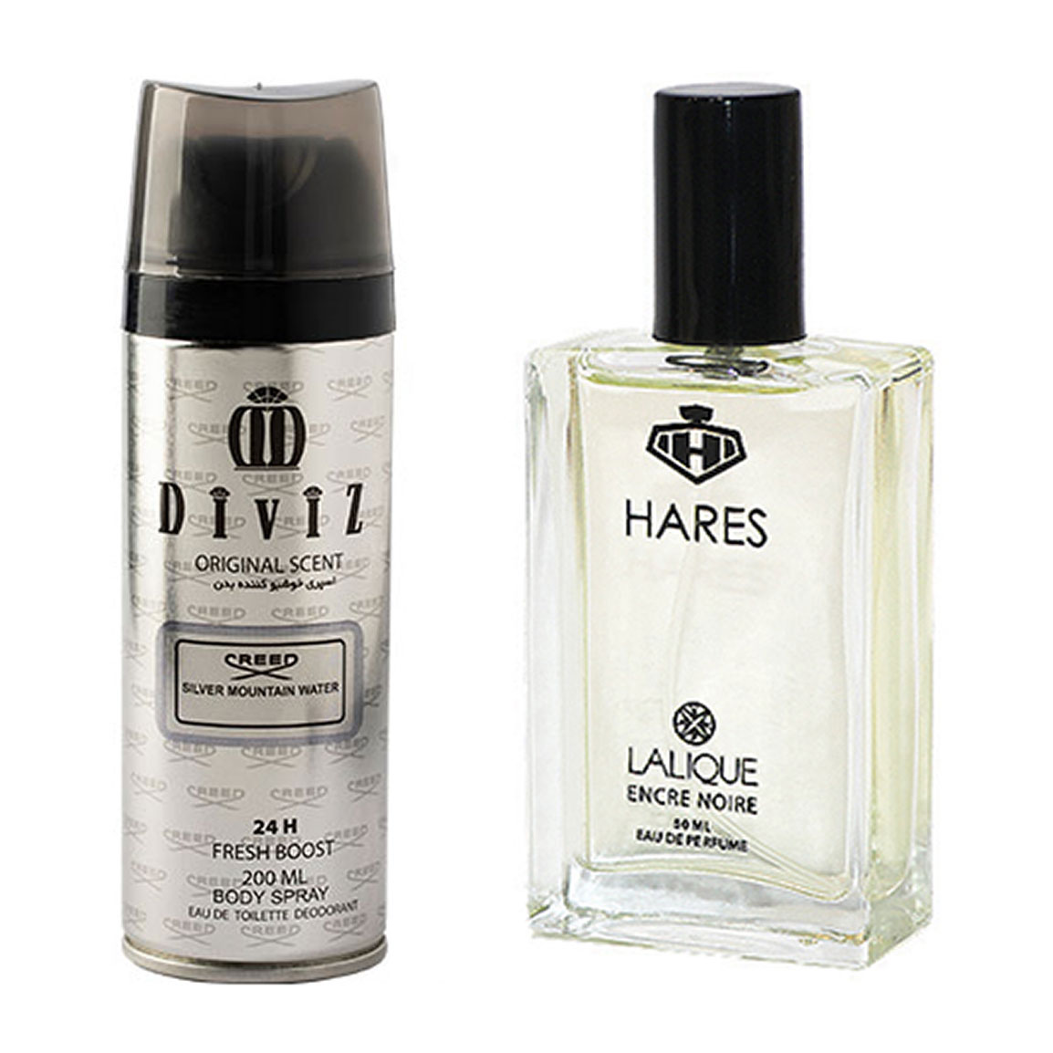پک هدیه روز مرد 2 عددی شامل اسپری بدن مدل Creed Silver Mountain Water و ادوپرفیوم مدل Lalique Encre Noire