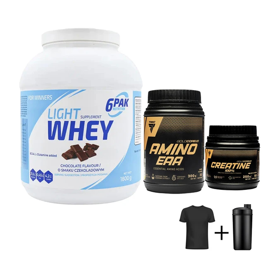 پک پودر لایت وی سیکس پک با طعم شکلات، پودر کراتین، پودر آمینو ای ای ای به همراه تیشرت و شیکر