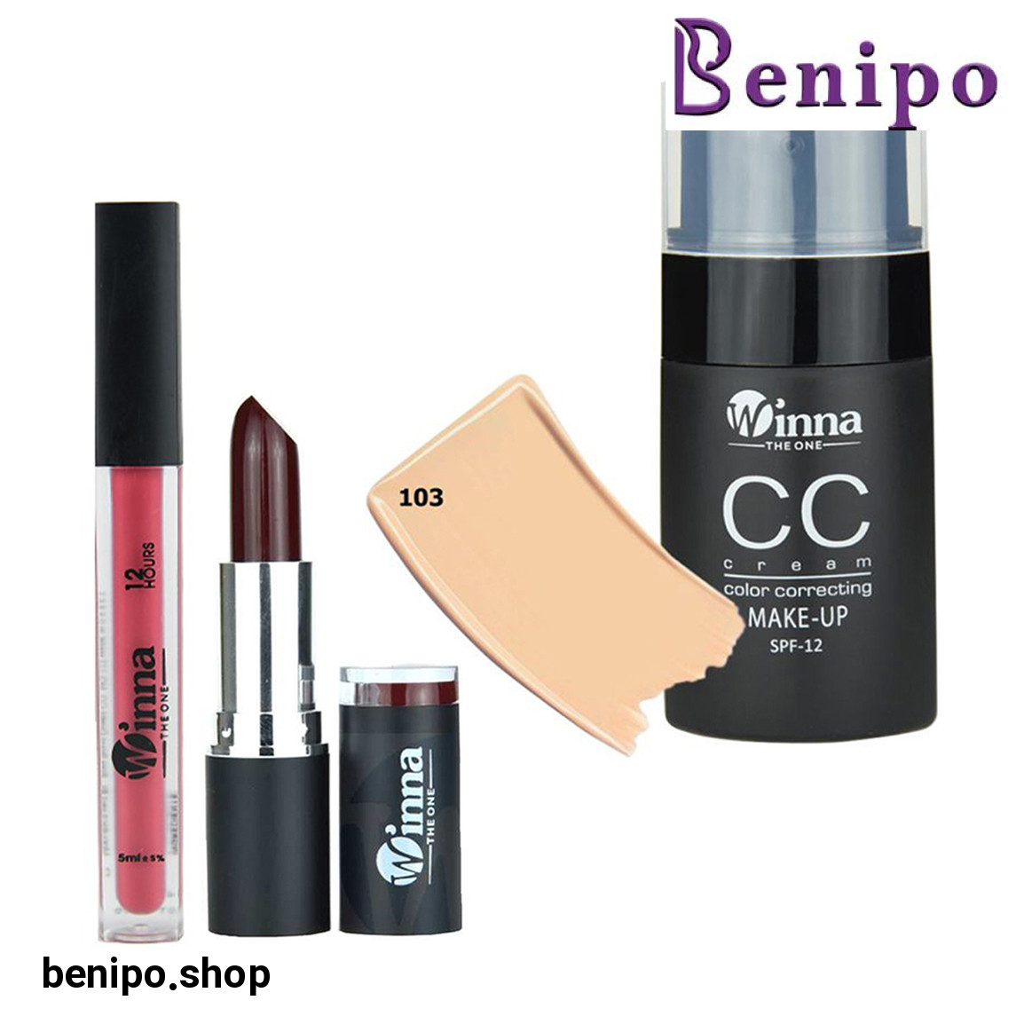 پک آرایشی سه عددی کرم پودرCC شماره 103 و رژلب جامد شماره 310 و رژلب مایع شماره 411